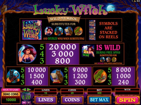 Выиграть прогрессивный джекпот в игровом аппарате Lucky Witch невозможно, так как он здесь не представлен. Зато можно получить максимальный фиксированный выигрыш в размере 20000 кредитов.